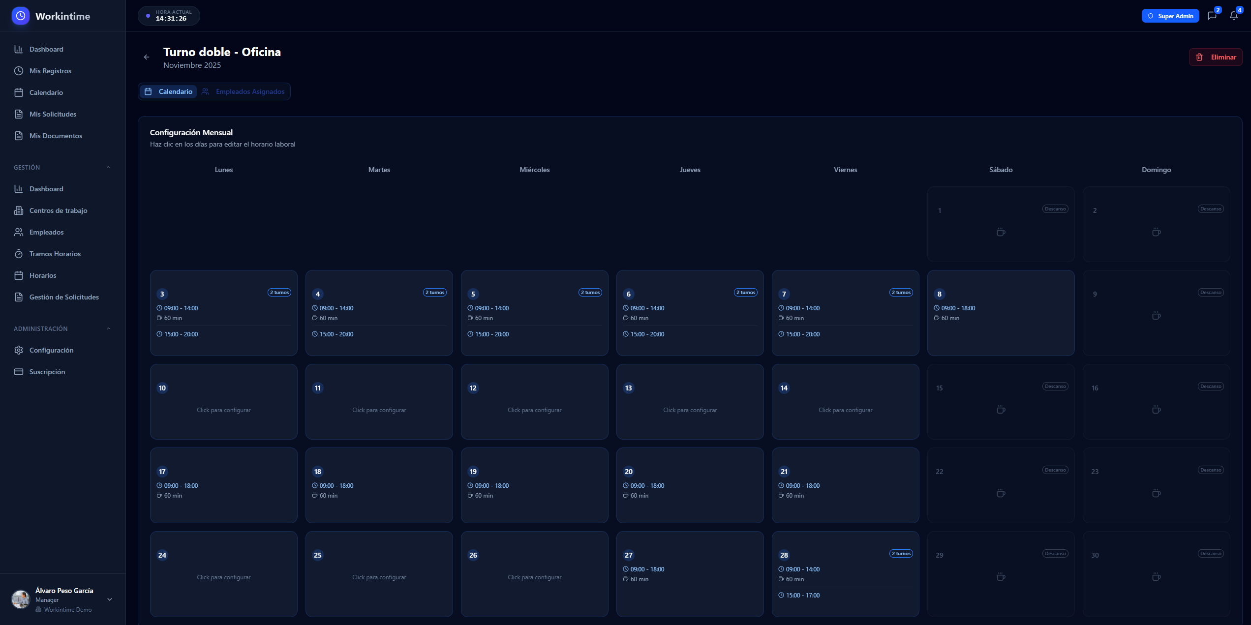 Crea y asigna horarios y turnos de forma masiva. Gestiona rotaciones, jornadas flexibles y planificación semanal o mensual desde un único panel.